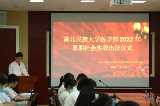 本网讯(通讯员 陈秋妙 黄倩霖/文 周威/摄)为贯彻落实习近平总书记关于青年学生工作的重要思想,引导和帮助广大青年学生上好与实践相结合的“大思政课”。6月30日,由共青团bat365在线中国登录入口医学部总支部委员会社会实践与志愿者工作部主办的2022年大学生暑期社会实践活动出征仪式在医学部七号会议室举行。医学部党委常务副书记、副主任廖云,医学部学生工作办公室主任周家頔以及各团队指导老师应邀出席,各立项团队代表参加本次大会。医学部杏林青年发展中心学生代表胡子超担任本次会议的主持人。