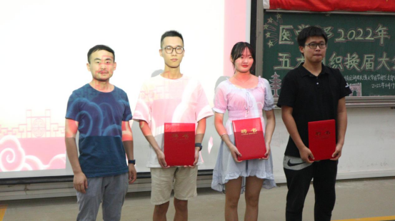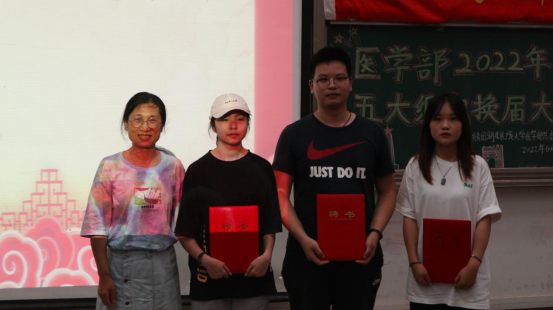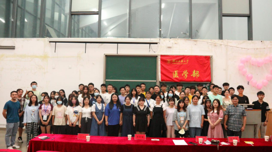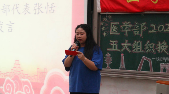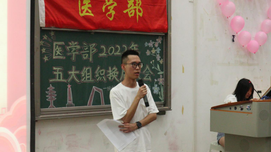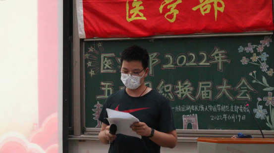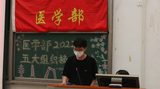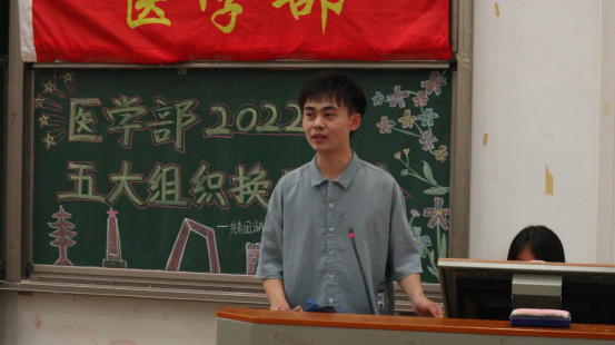本网讯(通讯员 王伟/文 李林芳 周美均 黄太斌/摄)为充分发挥大学生“自我教育、自我服务、自我管理、自我监督”的作用,增强学生干部队伍建设,6月19日,医学部2021-2022学年度学生干部换届大会在修远楼5B404举行。杏林青年发展中心指导老师郑娅,医学部团总支与青年志愿者协会指导老师陈建萍,医学部学生会指导老师周家頔,医学部公寓管理委员会指导老师高梦琪,学生工作办公室老师艾尔肯·吾斯曼应邀出席本次会议,医学部五大学生组织新老学生干部两百余人参会。杏林青年发展中心学生干部胡子超担任本次会议的主持人。