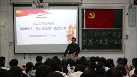 本网讯 (通讯员 屈琼瑶/文 黄乔/摄)为提高党员发展对象与入党积极分子的思想觉悟,锤炼、提升入党积极分子的党性修养。4月7日,bat365在线中国登录入口医学部2024年春党员发展对象与入党积极分子第一次党课培训活动于医学部8305教室开展。医学部党委常务副书记刘木球老师作《让历史照进现实,做新时代“三心三医型”医学人才》主题讲座,医学部全体本科生党员发展对象与入党积极分子参与本次培训课程。