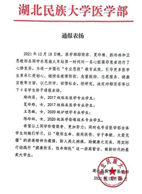 生如逆旅,一苇以航。鄢雨菲同学以自身坚持不懈的毅力与医者仁心为苇,横渡学海茫茫。她在校期间曾在医学部杏林青年发展中心任职,虽然部门事务繁忙,也每天要抽出时间去温习当日所学知识,在医院实习时,面对每天查房、换药、书写病历等事务都能处理的井井有条,并在闲暇时刻复习考研知识。除了出众的学习能力,最重要的便是她那医者仁心。在2021年12月18日晚,鄢雨菲同学在恩施火车站突遇一心脏骤停患者,危急时刻,在她身上体现了医学生的责任与担当,她和其他三名学生一起,第一时间对患者进行心肺复苏,不负医学生铮铮誓言。