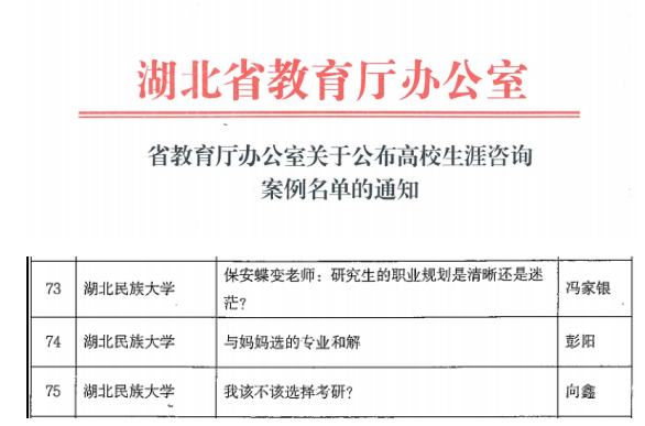 7月9日,湖北省高校生涯咨询案例评选结果揭晓,bat365在线中国登录入口研究生处冯家银老师申报的《保安蝶变老师:研究生的职业规划是清晰还是迷茫?》,研究生处向鑫老师申报的《我该不该选择考研?》,法学院彭阳老师申报的《与妈妈选的专业和解》等3个案例成功入选。