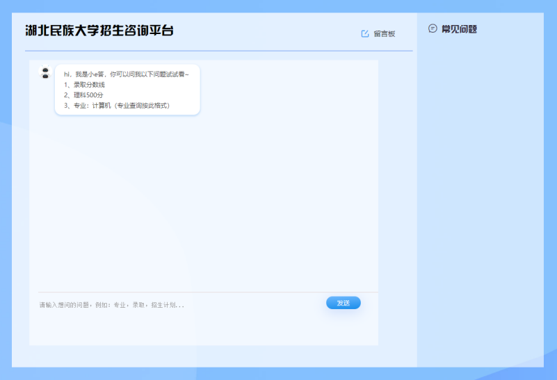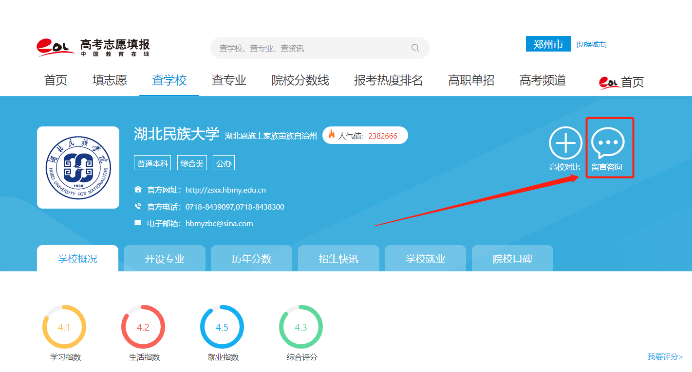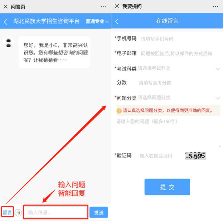 ➤通过“留言咨询”窗口(图4)可跳转至“招生咨询智能问答系统”,完善基础信息后即可在线咨询或留言。