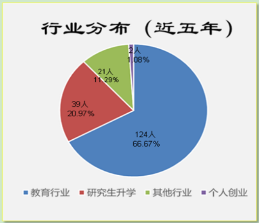 毕业生深受用人单位欢迎,就业率始终保持在90%以上,近五年教育行业就业占比66.7%,研究生升学占比20.97%,是全校考研率最高的专业之一,其中多名优秀学生还考取了南京大学、武汉大学、华中科技大学、四川大学、北京师范大学、华中师范大学等国内著名高校的硕士研究生。