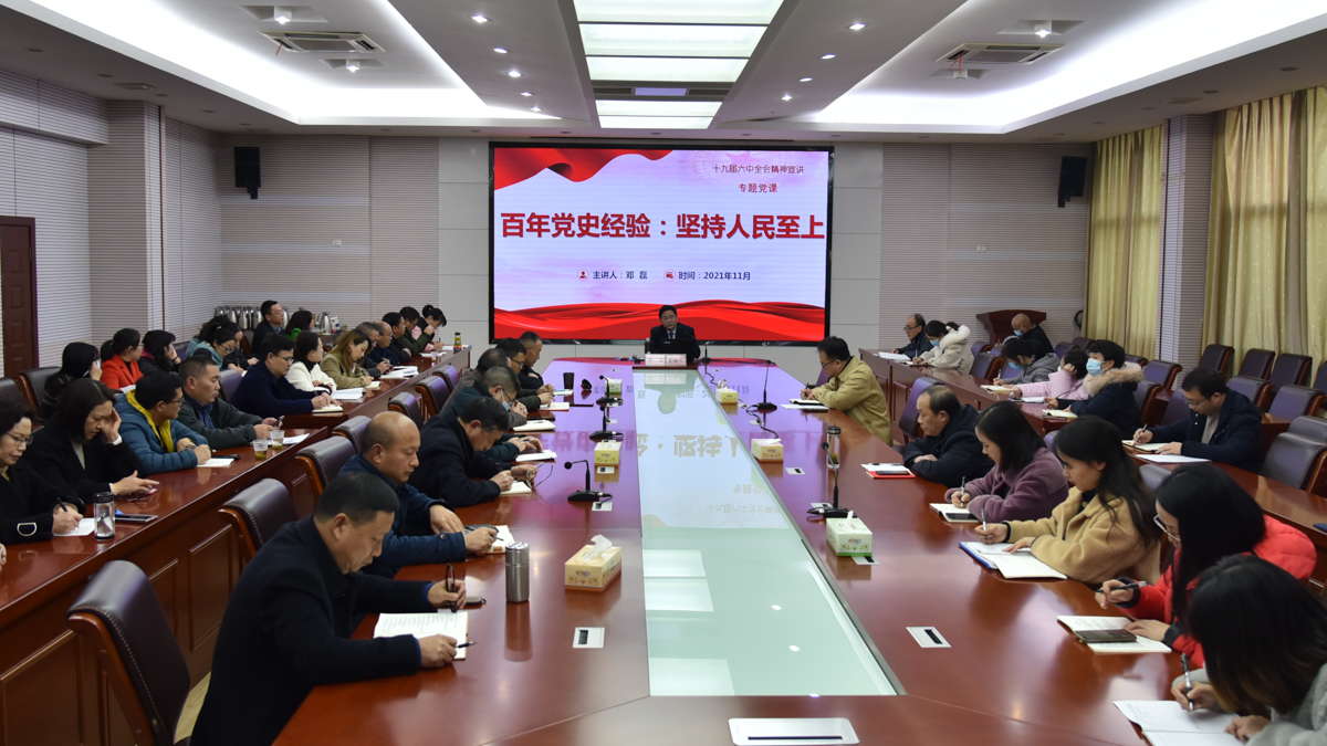 本网讯(记者 廖希为)11月30日,学校党委副书记邓磊在行政楼三号会议室为分管和联系单位的党员干部宣讲党的十九届六中全会精神,拉开了bat365官网开展十九届六中全会精神理论宣讲的序幕。