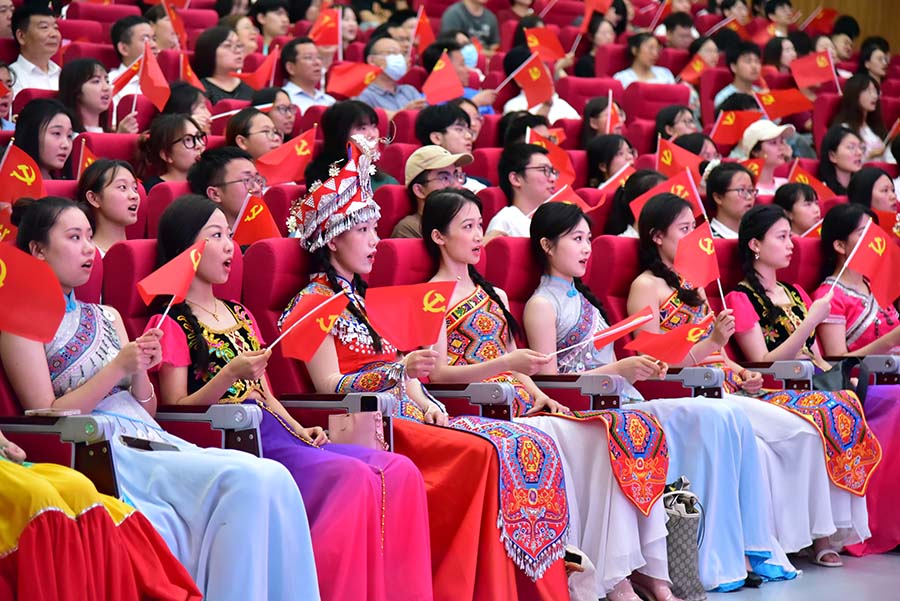 红色音乐党课将党史宣讲与经典旋律融为一体,引发了现场观众的强烈共鸣。马克思主义学院辅导员杨婷告诉记者,“作为思政教育一线的青年教师,我要按照习近平总书记的要求,争做青年朋友的知心人、青年工作的热心人、青年群众的引路人,引领各民族青年学子为强国建设、民族复兴贡献青春力量。”预备党员、医学部卓越医师班学生熊世尧坚持利用暑期社会实践开展乡村健康宣教工作,他表示,“一首首红色经典激荡着我们的青春记忆,我们要牢记习近平总书记对青年的谆谆教诲,既怀抱梦想又脚踏实地,既敢想敢为又善作善成,让青春在守卫人民健康的不懈奋斗中绽放异彩。”