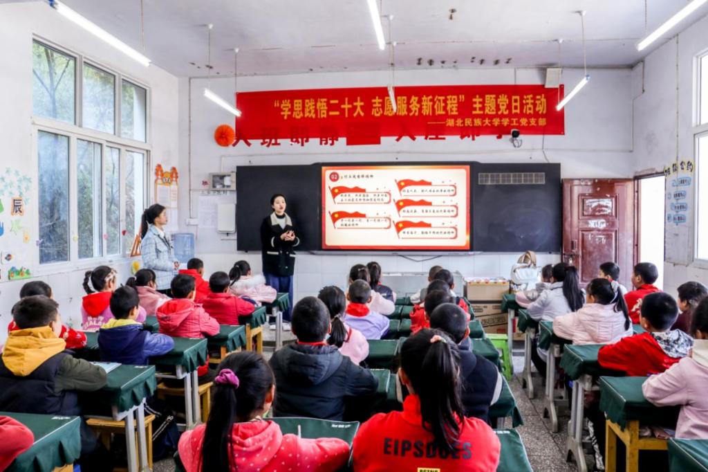 为深入学习宣传贯彻党的二十大精神,进一步弘扬志愿服务精神,3月15日,bat365官网学工党支部赴利川市凉雾乡马前小学开展“学思践悟二十大 志愿服务新征程”特色主题党日活动。学校党委副书记邓磊以普通党员身份出席活动,学工党支部全体党员、学校驻马前村工作人员、校青马班学员代表及马前小学五(1)班36名学生一同参与活动。